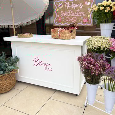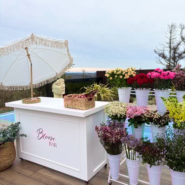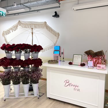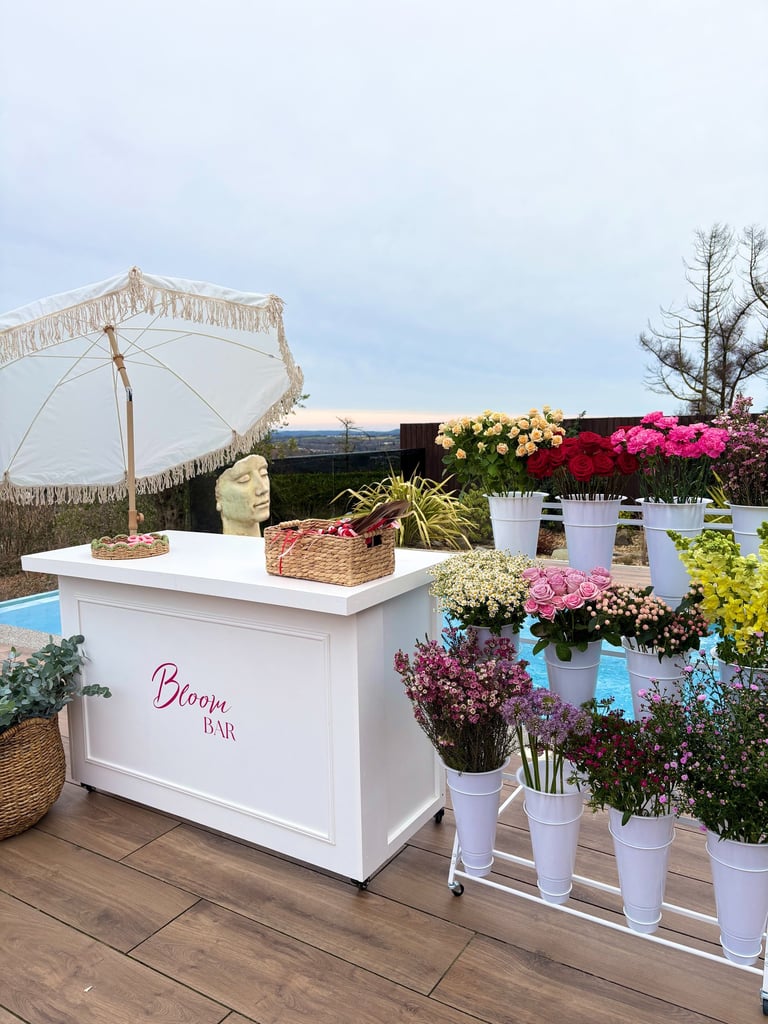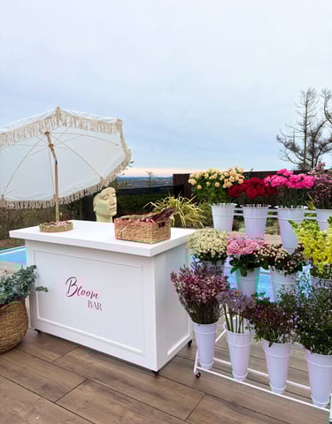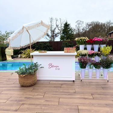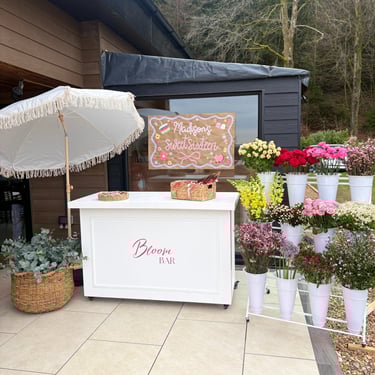 The Bloom Bar comes complete with fresh flowers and foliage displayed in a premium display. featuring a Bloom Bar cart, a parasol, bloom bar signage, and all the essentials for bouquet crafting, including snips, paper, twine, and ribbons. Everything you need to create gorgeous, personalised arrangements is provided! To enquire about hiring our Bloom Bar please complete the Enquiry Form below and we will be in contact with you soon to discuss your event requirements!